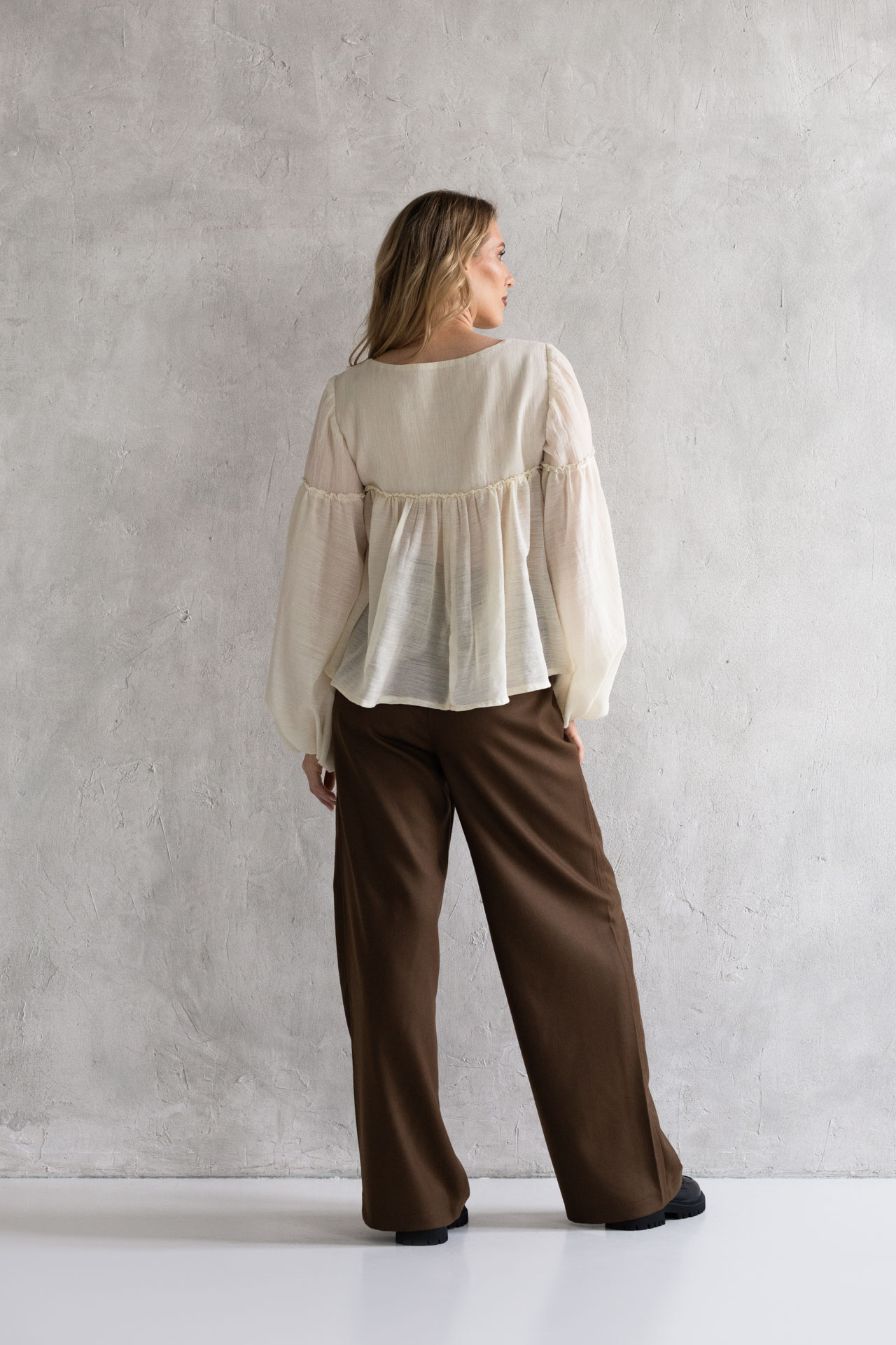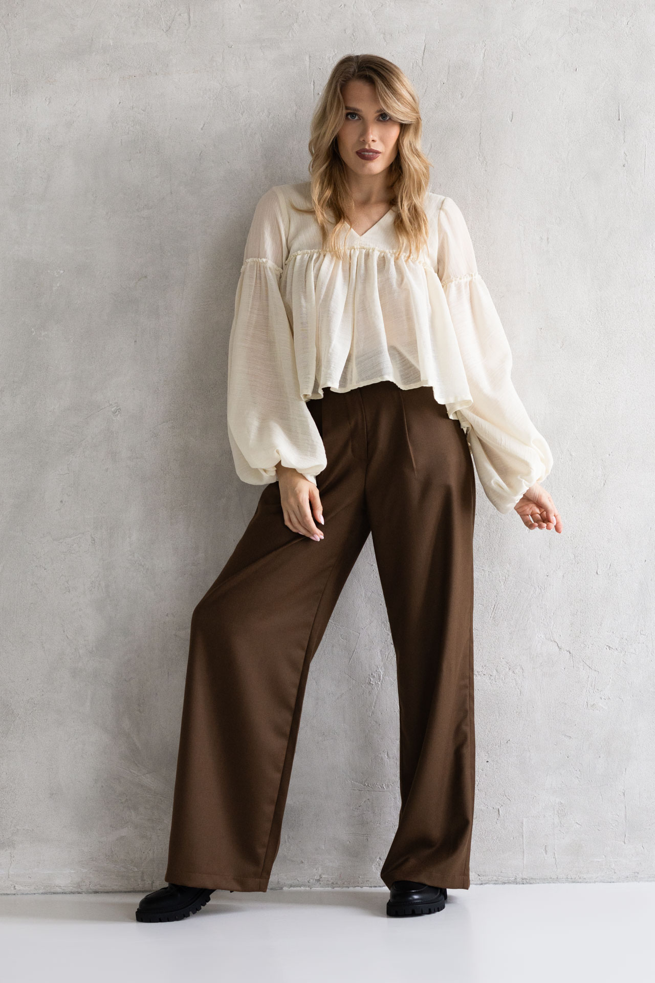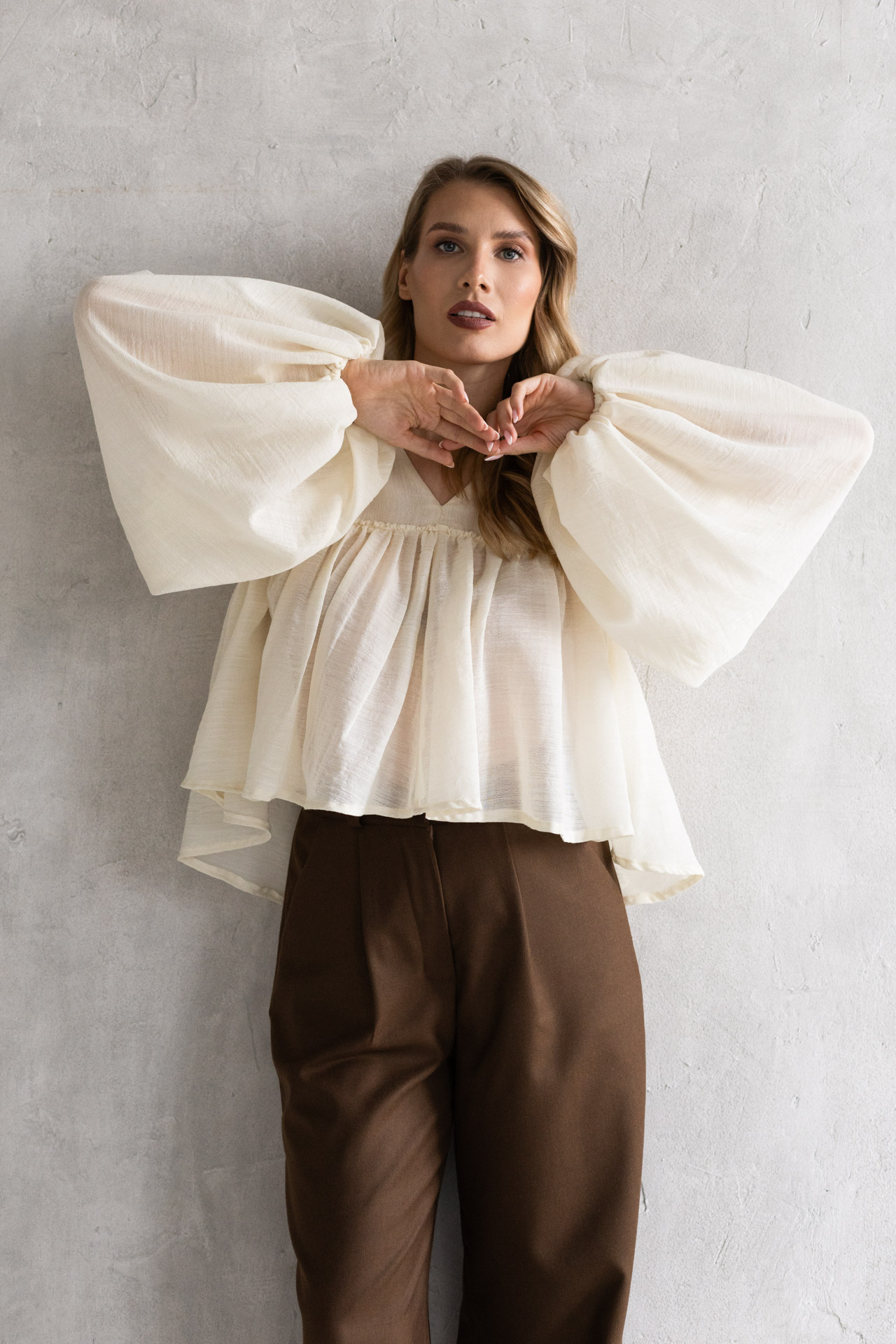 Bluzka posiada długie, bufiaste rękawy, zakończone gumką, dekolt w kształcie litery V, a jej dolną część stanowi obficie marszczona falbana.