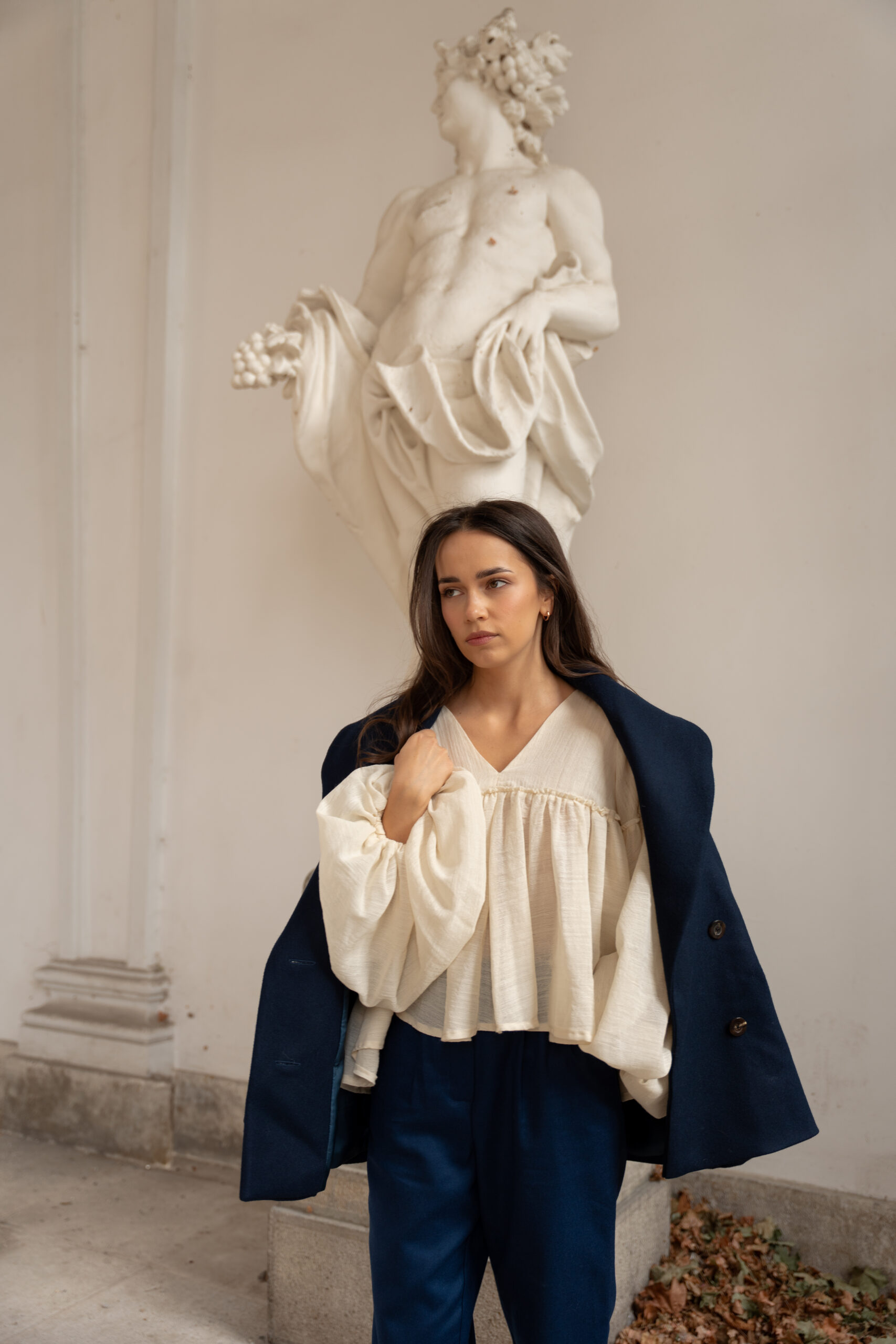 Bluzkę stworzyliśmy z ekskluzywnej, cieniutkiej, bardzo miękkiej, transparentnej tkaniny 100% wełnianej. Krój bluzki, nawiązujący do stylu boho, jest zwiewny i obszerny, Tkanina pięknie pracuje w ruchu. Bluzka ma nieco ekstrawagancki charakter, zwraca uwagę i przyciąga spojrzenia! Wyjątkowa i niepowtarzalna rzecz.