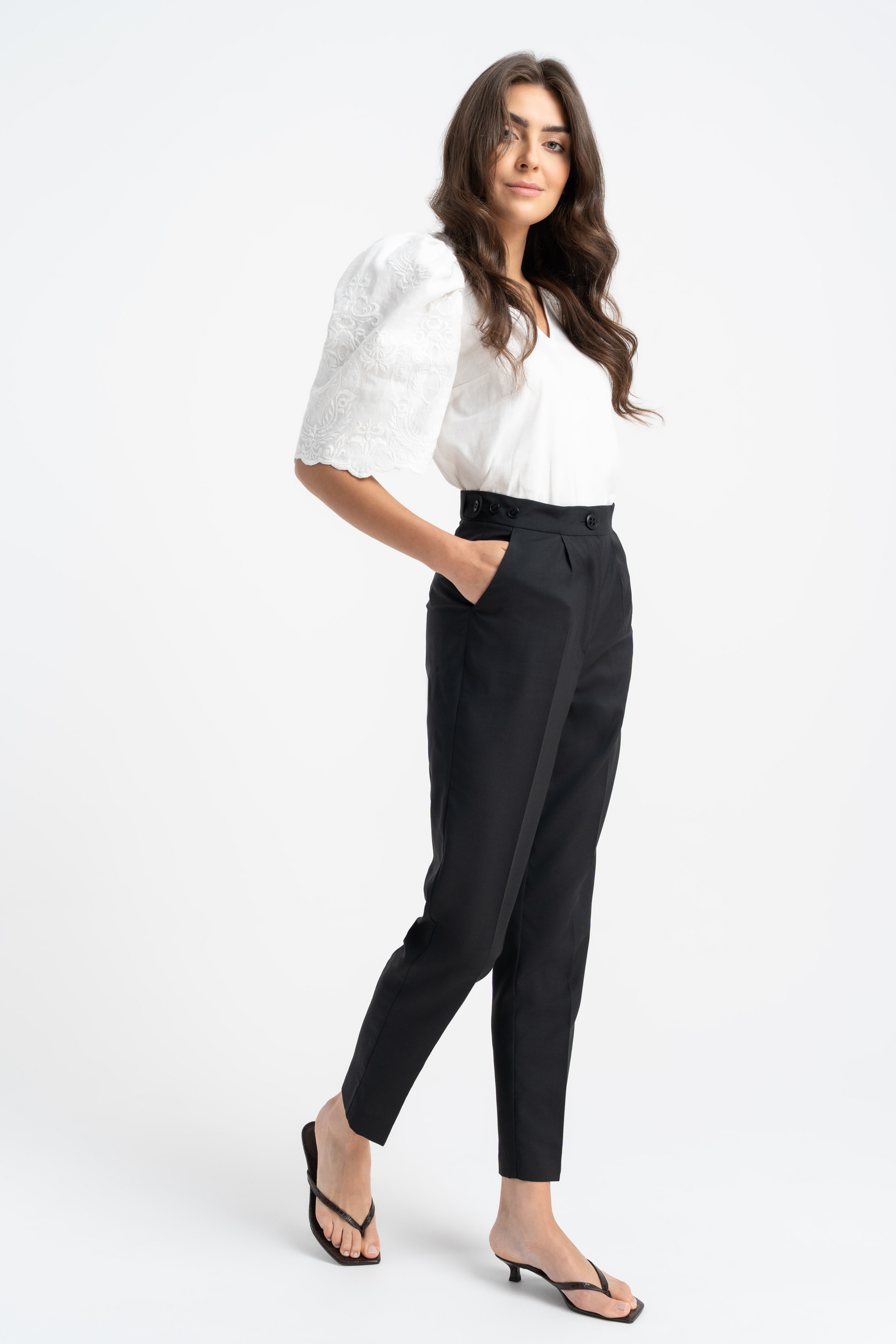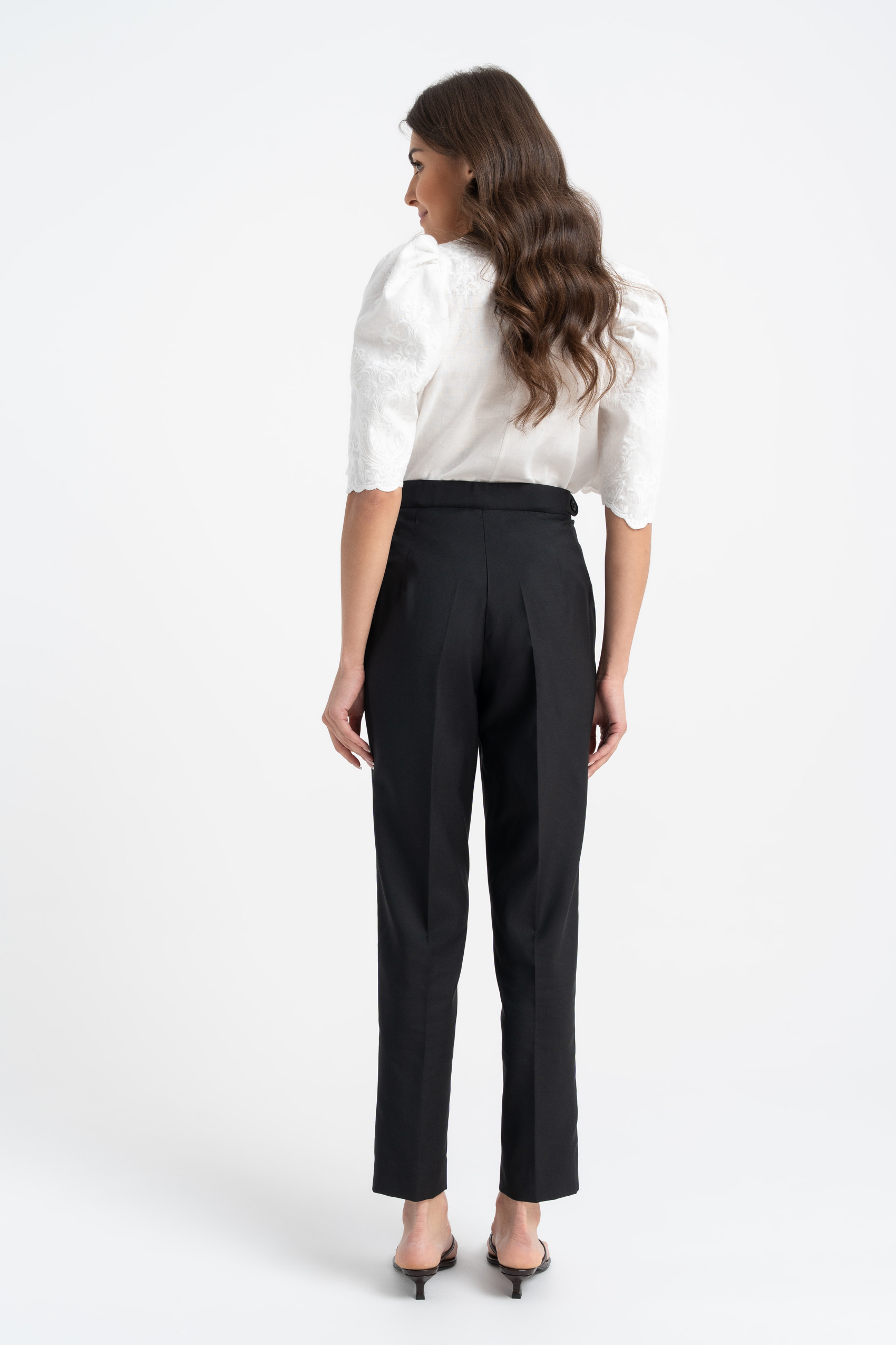 Cygaretki mają klasyczny, ponadczasowy, lekko dopasowany krój z wysokim stanem, zakładki z przodu, zaszewki modelujące talię z tyłu oraz kieszenie w karczkach biodrowych. Dla jak najlepszego dopasowania w talii, zastosowaliśmy unikalne rozwiązanie, spotykane w spodniach garniturowych najlepszych manufaktur. W tylnej części paska ukryta jest gumka, której naprężenie można regulować 3- stopniowo przez zapięcie na małe, boczne guziczki. Dzięki temu obwód pasa można dopasować idealnie do swojej figury. Spodnie sprawdzą się nawet przy bardzo dużej różnicy obwodów talii i bioder.