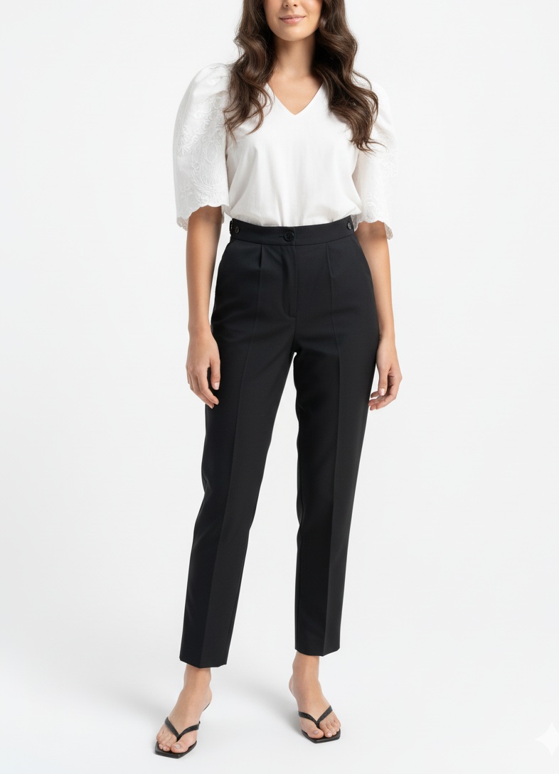 Cygaretki mają klasyczny, ponadczasowy, lekko dopasowany krój z wysokim stanem, zakładki z przodu, zaszewki modelujące talię z tyłu oraz kieszenie w karczkach biodrowych. Dla jak najlepszego dopasowania w talii, zastosowaliśmy unikalne rozwiązanie, spotykane w spodniach garniturowych najlepszych manufaktur. W tylnej części paska ukryta jest gumka, której naprężenie można regulować 3- stopniowo przez zapięcie na małe, boczne guziczki. Dzięki temu obwód pasa można dopasować idealnie do swojej figury. Spodnie sprawdzą się nawet przy bardzo dużej różnicy obwodów talii i bioder.