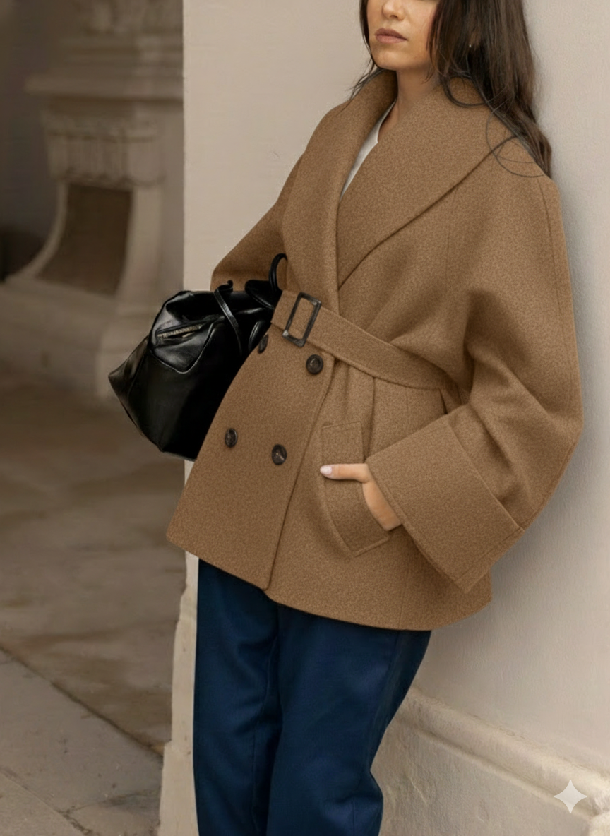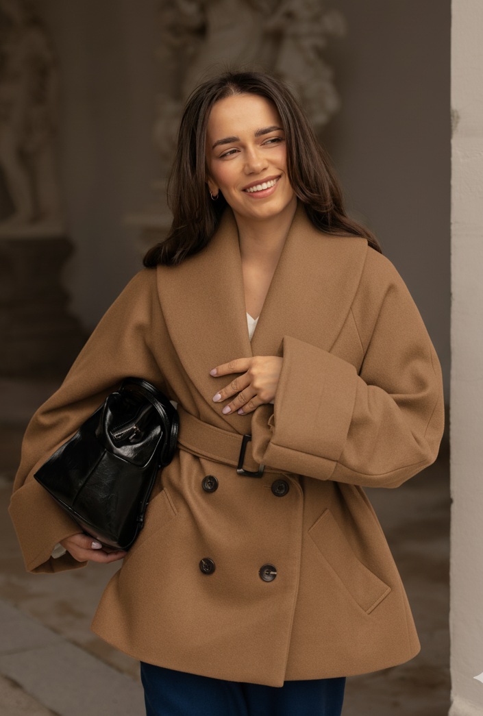 Piękny, ciepły, krótki płaszcz o lekko oversizowym kroju, uszyty ze 100% ekskluzywnej wełny typu Ambasador w kolorze camelowego brązu.