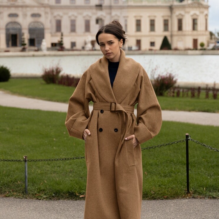 Płaszcz posiada szalowy kołnierz, raglanowe rękawy z wywiniętym mankietem oraz kieszenie ze skośnymi listewkami. Ma długość zakrywającą biodra. Zapinany jest na podwójny rząd rogowych guzików. Posiada podszewkę z acetetu. Do płaszcza dołączony jest pasek, dzięki któremu można podkreślić talię.