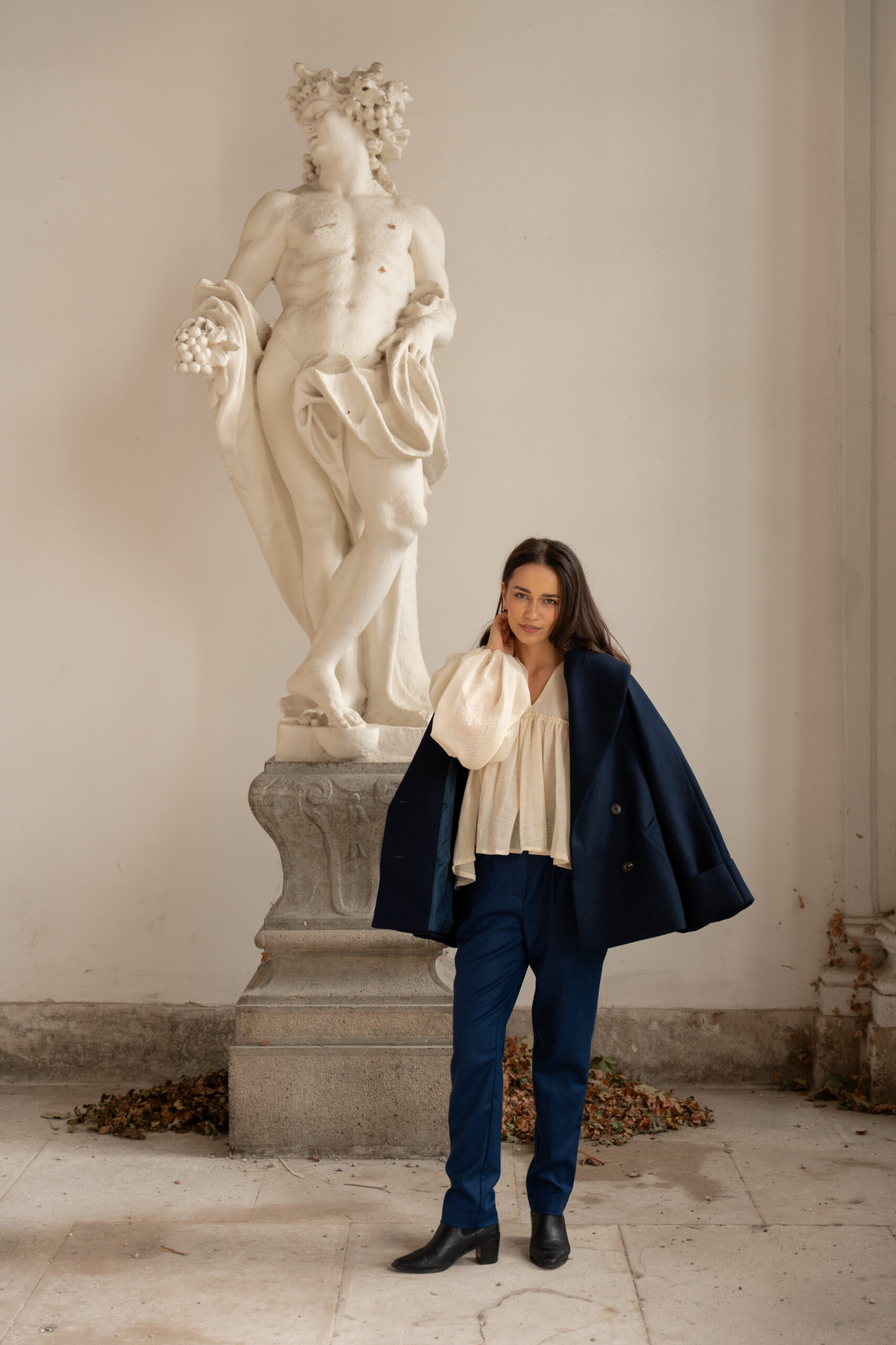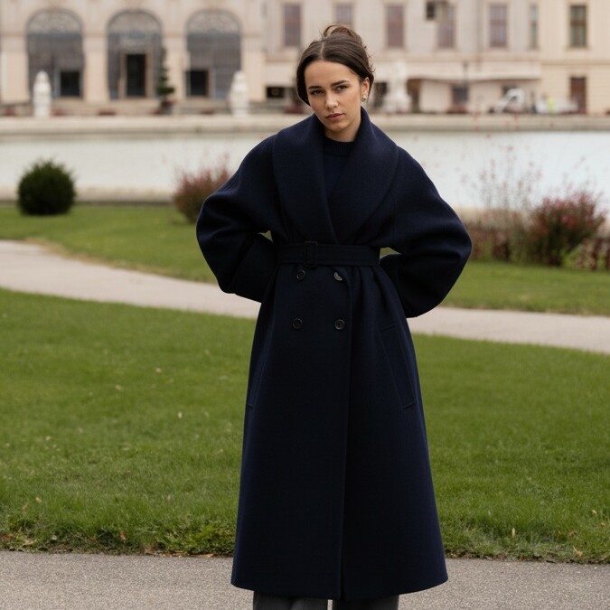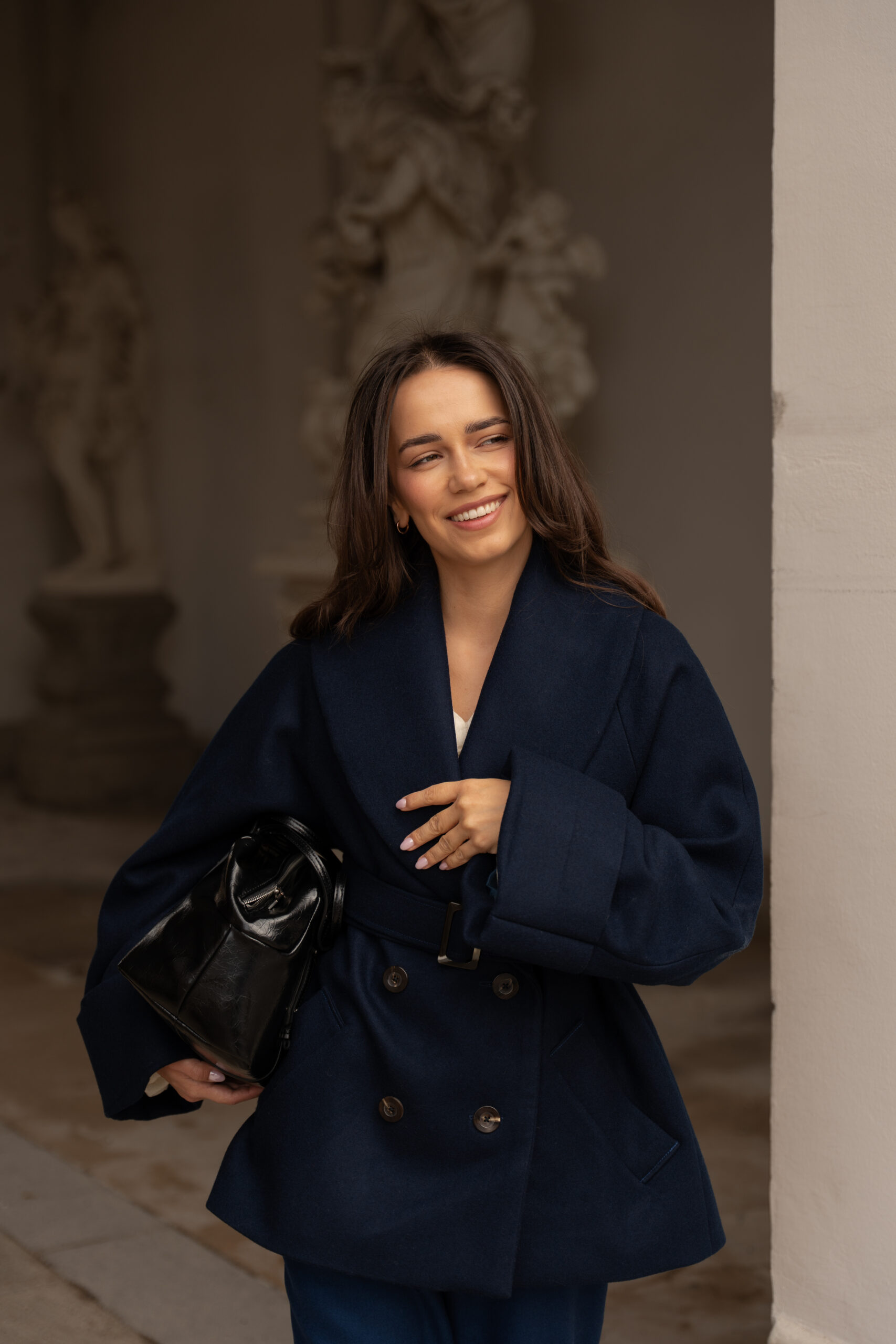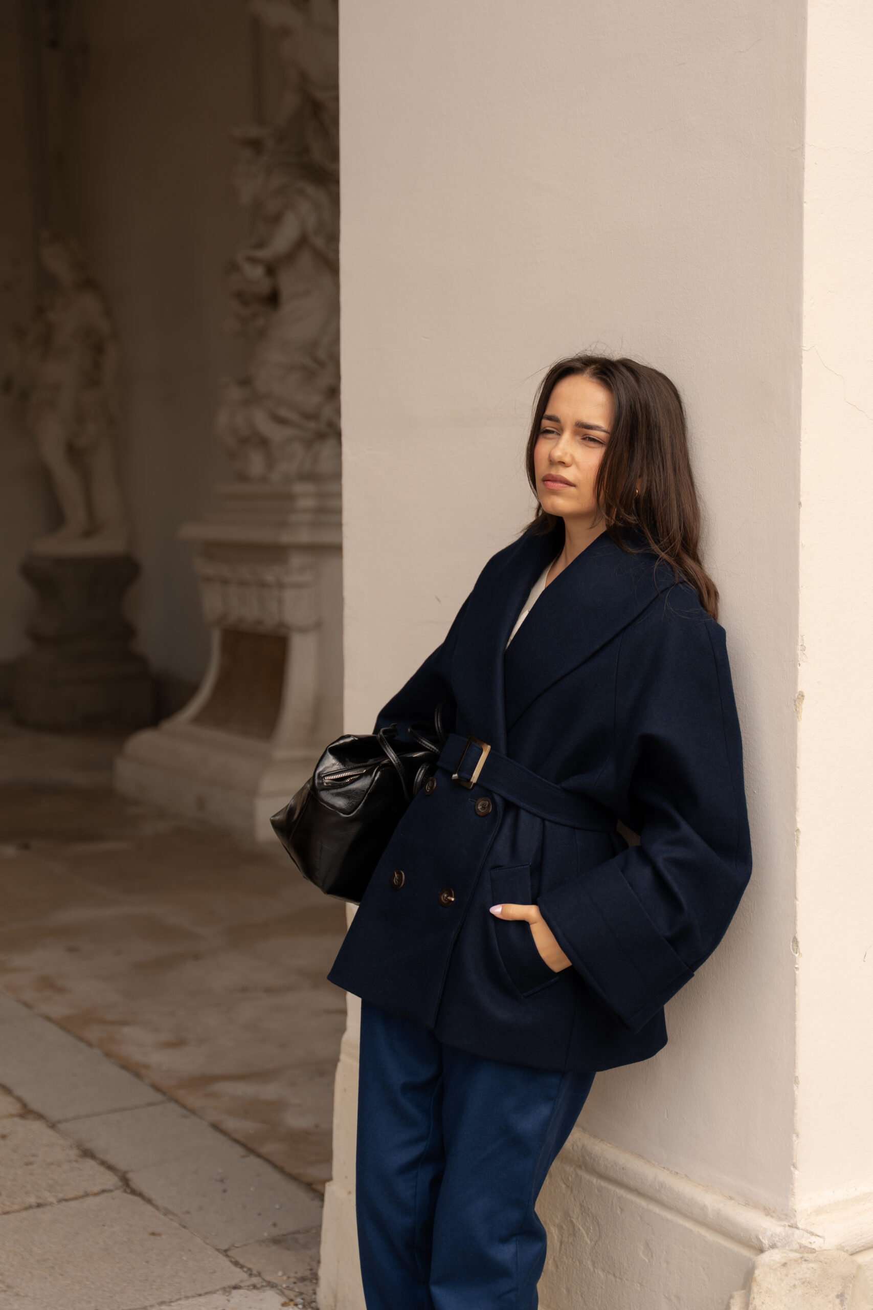 Piękny, ciepły, krótki płaszcz o lekko oversizowym kroju, uszyty ze 100% ekskluzywnej wełny typu Ambasador w kolorze granatowym.