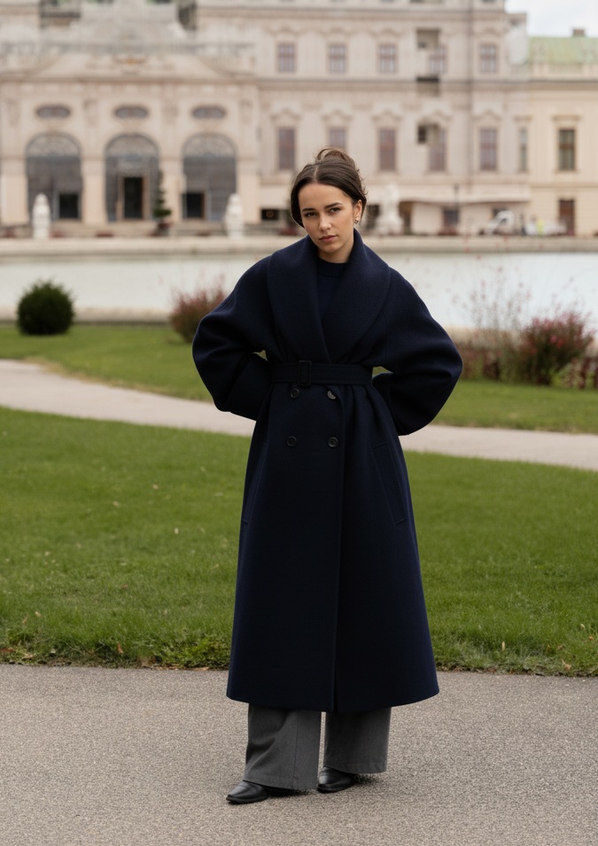 Piękny, ciepły płaszcz o lekko oversizowym kroju, uszyty ze 100% ekskluzywnej wełny typu Ambasador w kolorze granatowym..
