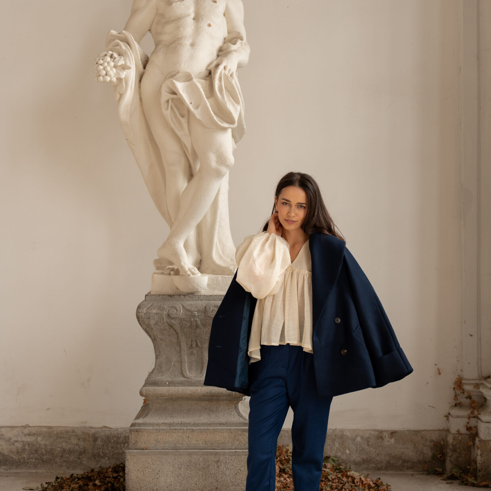 Nasze spodnie oferujemy w rozmiarach od 34 do 46 i w 3 długościach: petite, standard i tall. Różnią się one między sobą nie tylko samą długością nogawek, ale też umiejscowieniem linii kolana i wysokością stanu. Ten model ma długość 7/8 dla każdego z wzrostów. w ramach zamówienia indywidualnego możemy uszyć te spodnie również z długimi nogawkami- zapraszamy do kontaktu. Wskazówka: jeśli Twój wzrost odpowiada długości petite, ale chciałabyś zamówić długie spodnie, to polecamy napisać do nas, zamiast zamawiać spodnie o długości „standard”, gdyż proporcje mogą nie być dla Ciebie odpowiednie, a kolano może wypadać za nisko.